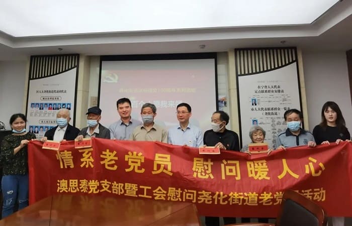 “情系老黨員,慰問暖人心”。2021年5月28日,中共澳思泰黨支部書記俞政君帶領公司黨員和干部慰問了堯化街道部分老黨員,這是在慶祝建黨100周年之際,公司黨支部開展黨史學習教育系列活動之一,旨在關心老同志,學習老黨員,交流學習心得,傳承紅色傳統,弘揚革命精神。