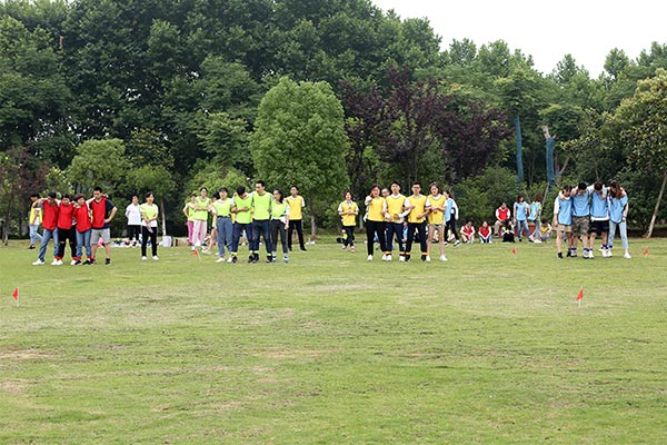 第二個比賽是四人五足,顧名思義就是每組派出4名隊員參加,用游戲道具將4個人的腿兩兩綁在一起,四人并行,先到終點的隊伍獲勝,這個游戲考驗的就是每組隊員配合的默契性,不是一個人跑的快就可以,一定要和大家步調一致才行。一二一二、一二一二紅隊的四個隊員邁著整齊的步伐,喊著響亮的口后,雖然一開始他們并不是最快的,但是他們一直跟隨著自己的口號節奏,逐步趕上前面的隊伍,有的隊伍一開始很快,但是缺乏口令,走著走著步調就不一致,有的隊伍中的隊員自己很著急,步子邁的很大,沒有顧及到其他隊員,導致摔倒或道具掉落,按照游戲規則要調整好了才能繼續比賽。最終紅隊獲勝。這個游戲就是告訴我們在工作中需要相互配合,才能完成任務,很多事情不是你一個人就可以,個人英雄在企業里是不存在。
